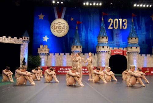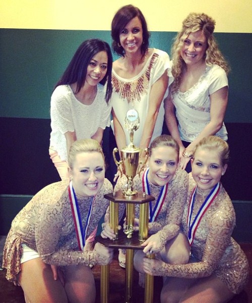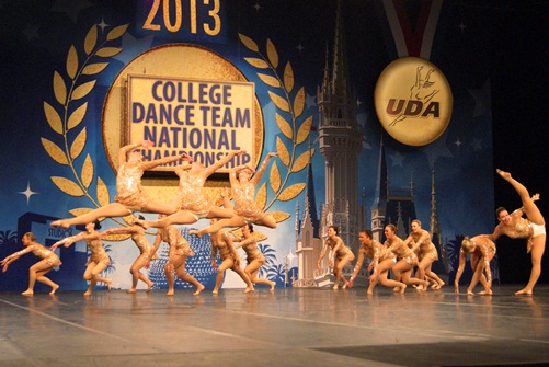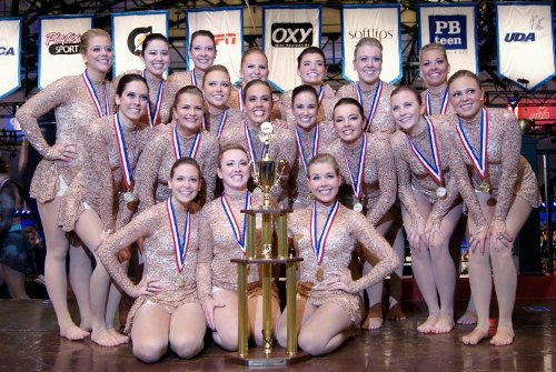 Congratulations to the University of St. Thomas dance team for winning the national championship in the college open jazz category! The competition was in Walt Disney World this past weekend in Orlando, Florida. The girls danced to an acoustic version of Lady Gaga’s “Edge of Glory” and wore a custom designed gorgeous rose gold lace dress made by The Line Up! It was definitely eye-catching and sparkled like crazy under the lights!