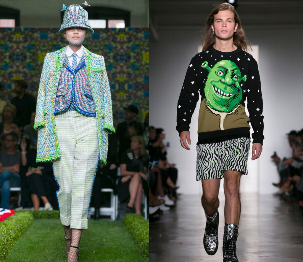 Thom Brown's crochet suit. I like the way the whole outfit looks like it has a similar texture, from the leggings to the pants and coat. Really interesting. And next to that is Jeremy Scott's pixelated Shrek sweater. This one brings up ideas of copyright, branding, video games, children's entertainment- again, really interested by this piece.