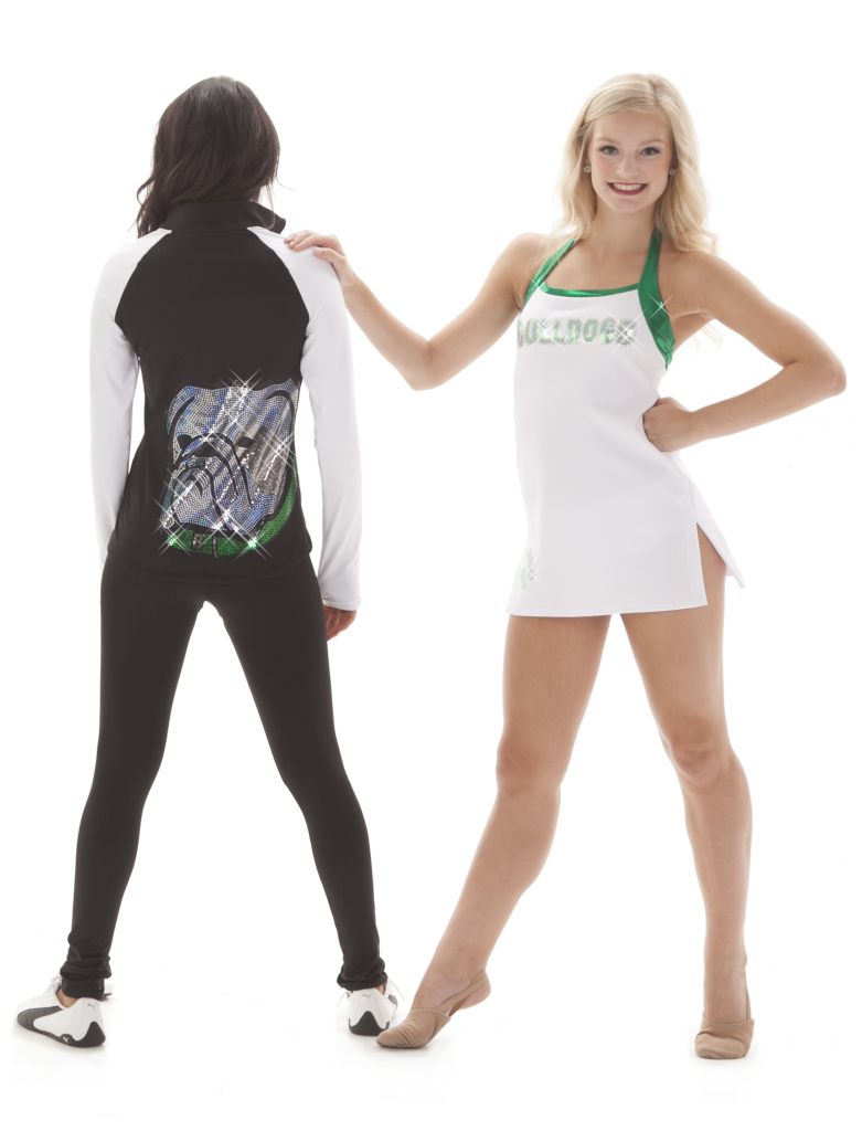 See something you want to add sparkle to? We also offer custom spangle designs! Send us your team logo or lettering and we can turn it into sparkling spangles! Team Bulldogs (below) is a great custom example. The team's logo was added to a jacket and lettering was added to a game day dress!