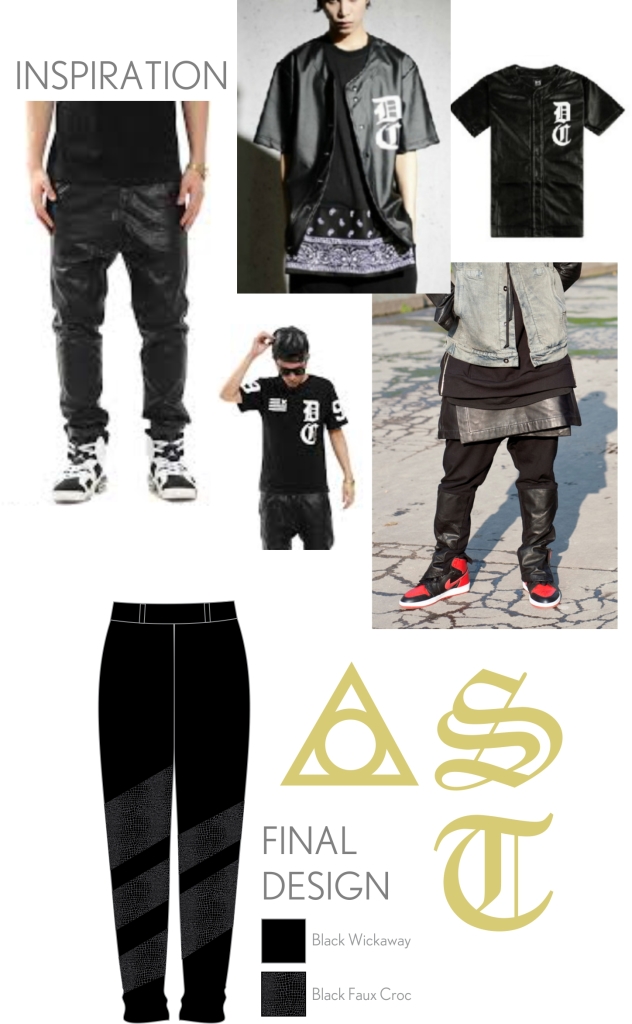 Custom harem pants were made in a stretch matte black wickaway fabric (to allow for movement) with a faux crocodile leather blocking that wrapped the leg from the calf to just above the knee. The different fabric textures gave the pants more interest so the pants didn't fall flat on stage.