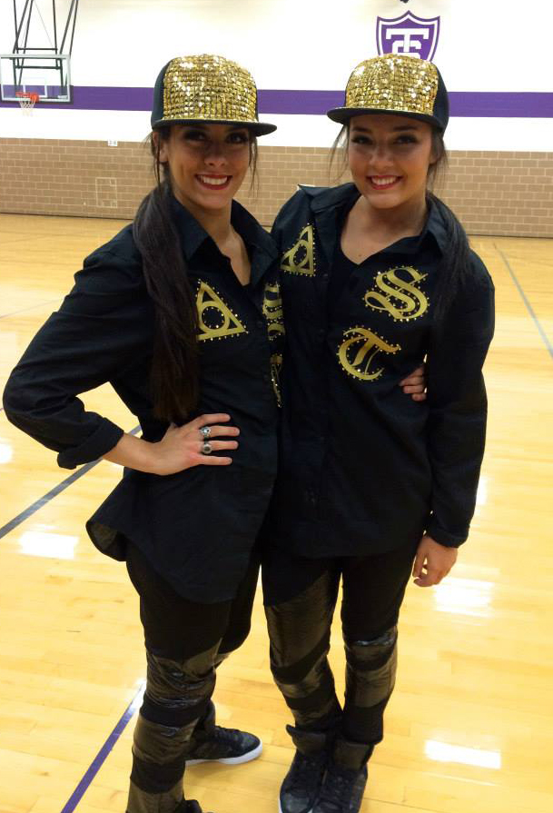 The team bought men's black dress shirts and The Line Up applied the gold letters and symbol. The triangle on the right side of the chest has a secret team meaning and the letters "S" & "T" stacked on the left are for, you guessed it, St. Thomas. The team also added gold rhinestones to make the lettering pop on stage.