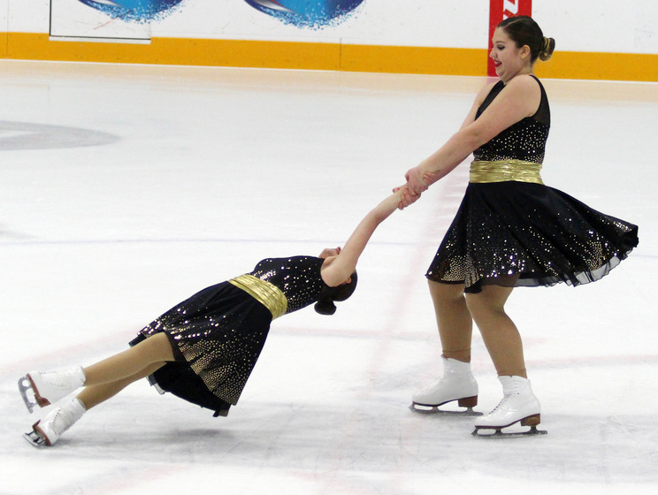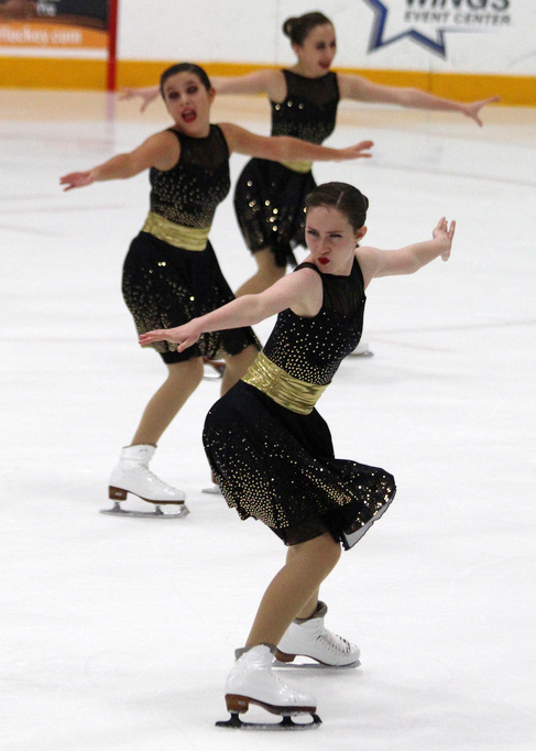To bring their theme to the ice, these girls needed to glitter and shine, and that means one thing: spangles. Lots of spangles! Each of these gold glossy spangles was printed to the skirt and bodice, which was made of a black, shiny tricot material. This design was no small feat for the team at The Line Up, but the final look was worth all the effort. This is definitely a dress you want to get a glimpse of in person. The fabric glitters with every move, and now the Chicago Radiance girls catch every eye at the rink!